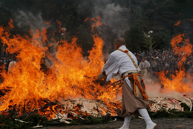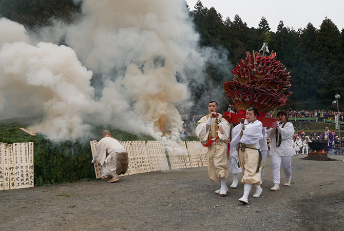The temple's annual fire-walking festival is held annually on the second Sunday of March. The event is one example of traditional asceticism practiced by a certain type of Buddhist monk called yamabushi. At the festival, worshippers pray for safety for their families and themselves, as well as for protection from traffic accidents. They then follow the yamabushi as they walk barefoot over smoldering coals produced by a sacred fire. The main highlight of the event is seeing the monks walk through the flames as they chant.
