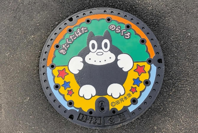 以漫画“黑野狗”系列的主人公黑野狗(本名:野狗黑吉)为主题设计的下水井盖。作者田河水泡于1929年至1931年间曾居住在东京都北区田端,并在这里创作发表了“黑野狗”。黑野狗在困境中勇往直前开拓自己人生道路的奋斗精神深受众人喜爱,是一部昭和初期的代表性漫画。您可以在明治至昭和年间文人与艺术家们生活并聚集的“田端文士艺术家村”中找到黑野狗的身影。