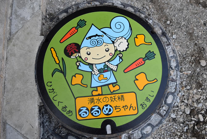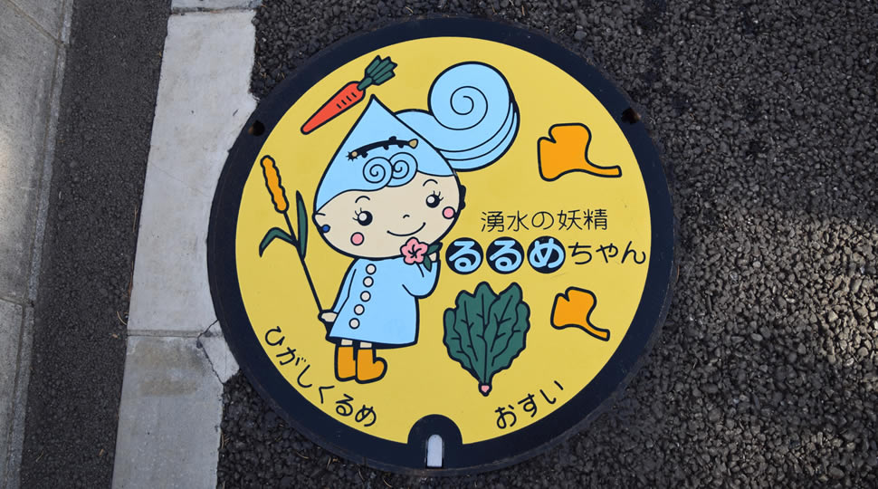 以东久留米市地区资源宣传卡通人物“涌水妖精璐璐咩”为主题设计的下水井盖放置在市内各地。您可以在欣赏东久留米美丽的水环境的同时,留意一下这些下水井盖。