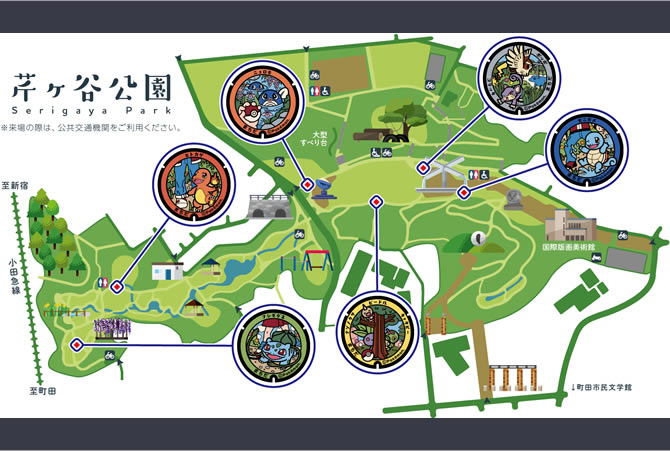 “宝可梦井盖”是株式会社宝可梦为促进各地旅游业而向全国捐赠的原创下水井盖,每款井盖均为世界唯一一枚。芹谷公园内共有6枚。这里不仅是东京都内的首个放置地,而且6枚井盖全部集中放置在同一场所(公园内)的,日本全国也仅有町田市一处。宝可梦的作者田尻智在町田渡过了少年时代,而这段生活经验又成为了他创作宝可梦的灵感来源。