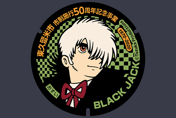 这是以手冢治虫老师的漫画作品《怪医黑杰克》为主题的井盖。手冢老师在东久留米市度过他的晚年,还出席了市的成人式。市内有6处地方都设置了该井盖。