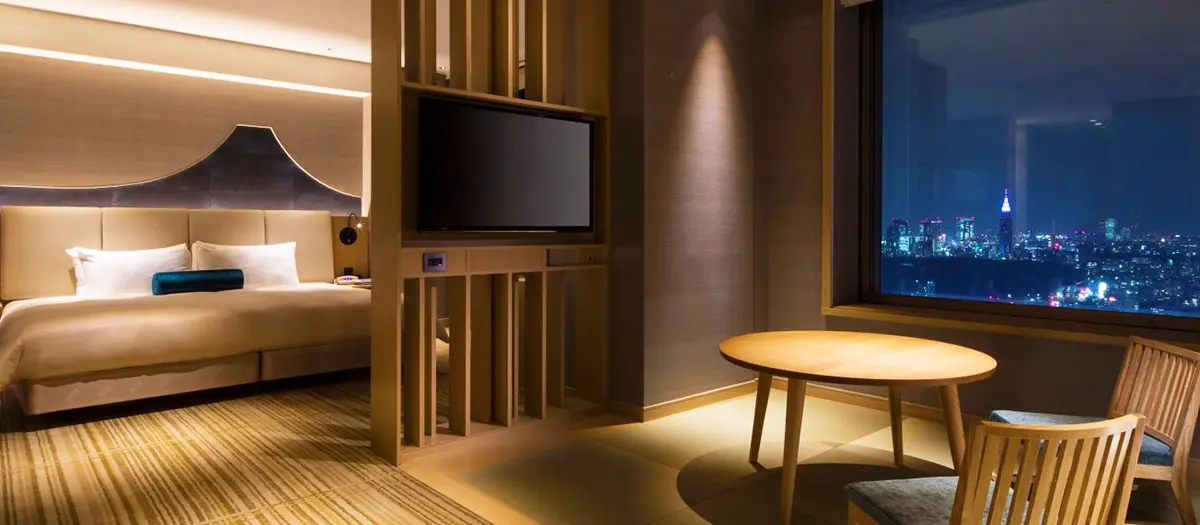 可在最高层的酒吧“BELLOVISTO”品尝饮料,俯瞰街景。还可在近地面楼层的花园酒廊“坐忘”里欣赏知名庭院设计师所设计的日式庭院,享受咖啡和甜品。塔楼内的剧场定期举办日本传统艺术——能和狂言的演出。请至酒店前台或在线网站了解演出日程。