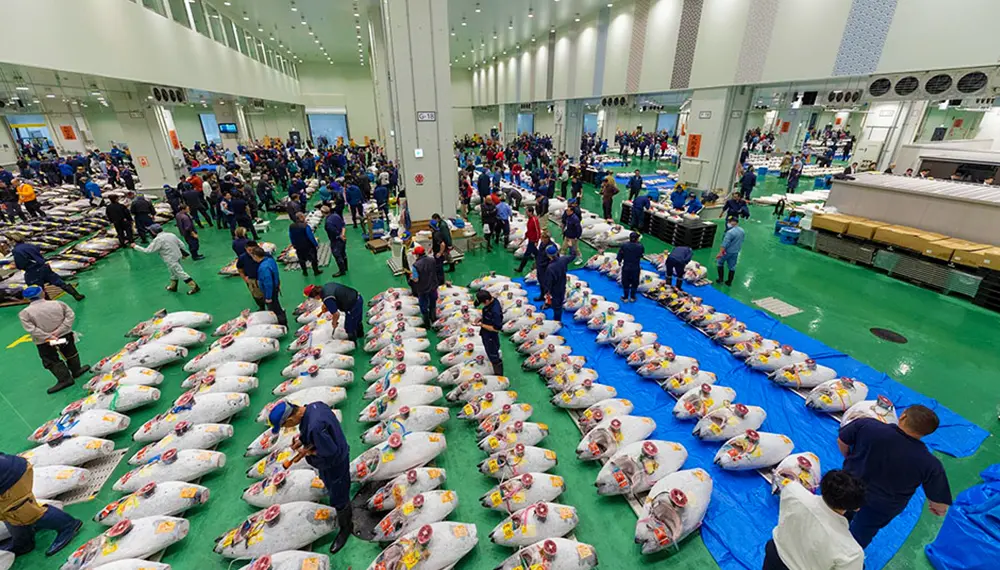搬迁至丰洲的鱼市场2018年10月11日开业。在此,您可从参观者通道或参观连廊观看金枪鱼拍卖活动,也可在多达39间的餐厅内大啖美食。水产中介批发场地大楼内有70多间商店,出售味噌、海苔、干货、日式菜刀、特产品等各类商品,琳琅满目。
