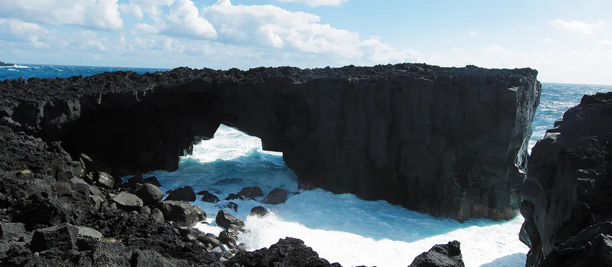 1643年火山喷发的熔岩流形成了今崎海岸,这里的“眼镜岩”是经过波浪长年的侵蚀而成的海蚀洞。这块伸向大海的岩石上曾有两处拱形空洞,形状宛如眼镜,但1959年伊势湾台风导致其中一个空洞损坏,变成现有风貌。