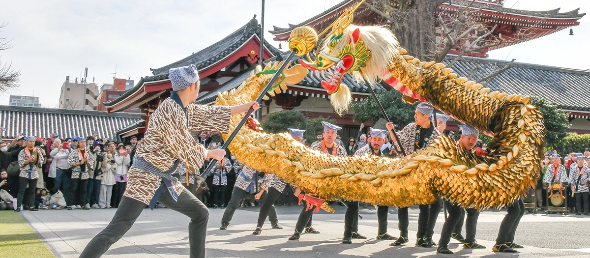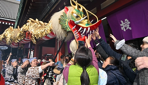 浅草寺的正式名称是金龙山浅草寺,“金龙山”寓意“金色龙之山”。这一名字由来于观音作为从天而降的佛教守护者金龙出现的传说。因此,在同一天会与此仪式一起在院内上演“金龙之舞”。