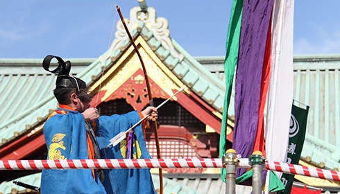 神田明神作为镇守江户城东北门(被视为传统凶位)的守护神而为人熟知。撒豆仪式开始前,身穿古代武士装束的神职人员会举行“鸣弦仪式”。在此仪式上,神职人员会朝向东北门(鬼门)及西南门(里鬼门)的方向做出射箭的动作。撒豆仪式则由“本命年的男女”从特设的通道进行。