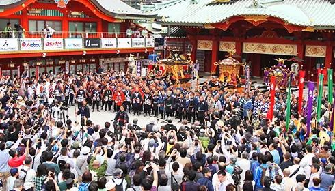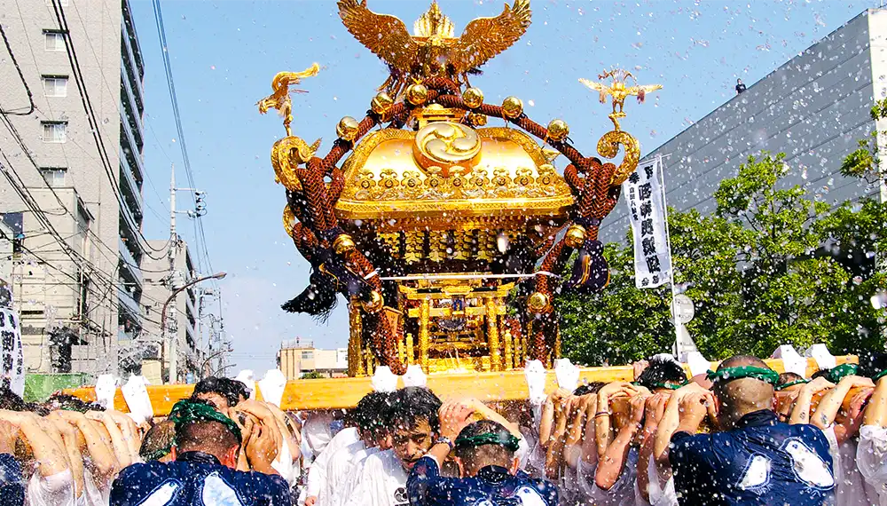 富冈八幡宫在8月15日前后举办的“深川八幡祭”,是江户三大祭之一。由于人们会将清除秽气的水泼向神轿,因此该活动又被称为“泼水节”。活动中,神轿轿夫和现场观众融为一体,呈现出充满活力的热闹景象。