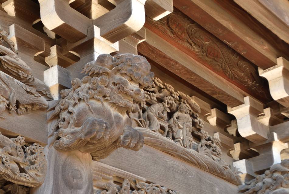 Es lohnt sich auf jeden Fall, die Schuhe auszuziehen und den Eintrittspreis von 400 Yen zu bezahlen, um die buddhistischen Schnitzereien zu bewundern und die inneren Gärten zu erkunden. Die geschnitzten Holztafeln, die das innere Heiligtum (Naiden) bedecken, zeigen Aspekte des Lebens und der Lehren Buddhas. Der Detailreichtum und die Ausdruckskraft der Gesichter sind beeindruckend. Die Schnitzereien wurden zwischen 1915 und 1929 von mehreren Künstlern ausgeführt, von denen einige aus der näheren Umgebung stammten. Verpassen Sie nicht die wilden Drachen, die die Konstruktion auf der unteren Ebene stützen. Das innere Heiligtum und seine Schnitzereien sind klimatisiert und durch Glas vor den Elementen geschützt, so dass es zu jeder Jahreszeit einen angenehmen Besuch gestattet.