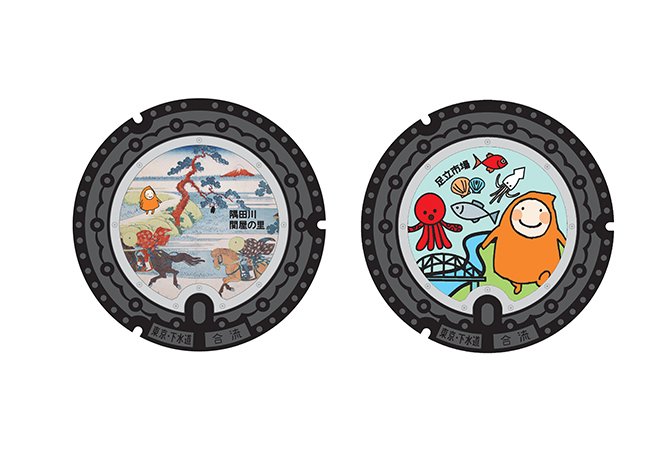 Das Adachi Feuerwerk, eine Sommer-Kulturattraktion des Stadtbezirks Adachi und View-Bow, Maskottchen der sogenannten "Beautiful-Windows" Bewegung sind auf diesem Kanaldeckel dargestellt. Unter anderen finden sich überall die Kanaldeckel im Stadtbezirk mit den unterschiedlichsten Motiven, z.B. dem Feuerwerk, das Sekiya no sato, der Adachi Fischmarkt, das Tôkyô-Budo-Kan, der Shobunuma Park, die Gotanno Hydrophilic green road und Nishiarai Daishi - um nur einige zu nennen.