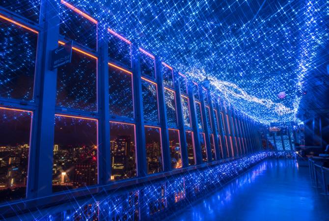 Sie können den Aufzug nehmen oder 600 Stufen zur Hauptplattform hinaufsteigen, die sich 150 Meter über dem Boden befindet. Wenn Sie Glück haben, können Sie an sonnigen Tagen sogar einen Blick auf den Berg Fuji werfen, der sich in weiter Ferne erhebt. Wenn Sie keine Höhenangst haben, sollten Sie sich auf die im Boden eingelassenen gläsernen „Skywalk Windows“ stellen und direkt hinab auf den Erdboden schauen, der sich fast 145 Meter unter Ihren Füßen befindet. Die höchste Aussichtsplattform auf 250 Meter Höhe über dem Erdboden ist mit geometrischen Spiegeln und LED-Beleuchtung ausgestattet. Dort zu stehen fühlt sich so an, als würde man in einem Raumschiff über der Stadt schweben.