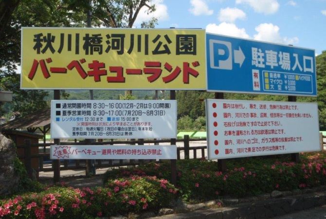 An den Ufern des Akigawa und nur wenige Minuten vom Bahnhof Musashiitsukaichi befindet sich das Akikawabashi River Park Barbecue Land, ein idealer Ort zum Grillen oder für eine Party unter freiem Himmel. Der Park stellt das Grillzubehör und den Brennstoff, Sie bringen Speisen und Getränke mit. Das heißt nicht zwangsläufig, dass Sie alles aus Stadt hierher schleppen müssen. Die Geschäfte in der Nähe sind gut gefüllt und wenn Sie auf Japanisch bestellen können, bringt Ihnen auch ein Lieferservice alles von Sets mit verschiedenen Fleischsorten bis hin zu Bierfässchen. Der Park ist – außer zwischen Mitte Juli und Ende August – dienstags geschlossen. Barbecue Land ist insbesondere im Sommer sehr belebt.