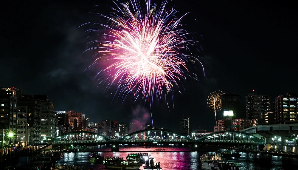 Die Geschichte des Feuerwerksfestes am Sumida-Fluss reicht bis ins Jahr 1733 zurück, als die erste Zeremonie zur Öffnung des Ryogoku-Flusses stattfand. Diese Zeremonie wurde abgehalten, um für die Seelen der Opfer der Hungersnot und Seuche zu beten, die 1732 die Region heimgesucht hatten. Die Zeremonie zur Öffnung des Ryogoku-Flusses fand bis 1961 stromaufwärts der Ryogoku-Brücke statt. Im Jahr 1978 wurde sie in Sumida-Fluss-Feuerwerksfest umbenannt. Heute ist es eines der größten und berühmtesten Feuerwerksfeste in Tokyo. Neben dem traditionellen Feuerwerk findet am Hauptveranstaltungsort auch ein Wettbewerb statt, bei dem neue und innovative Feuerwerkskreationen um Ihre Aufmerksamkeit wetteifern.