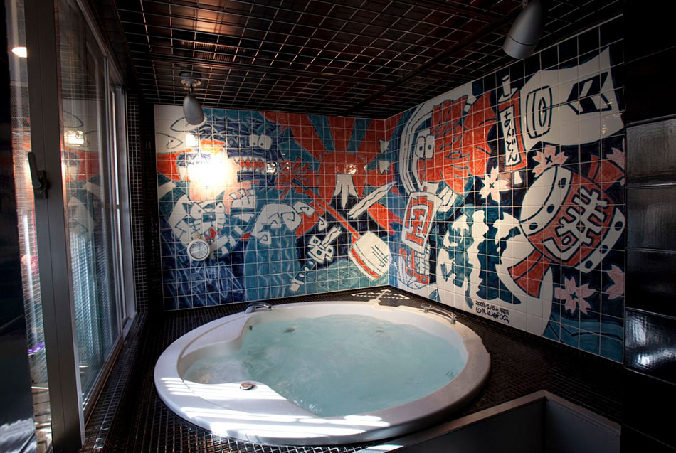 In addition to traditional Japanese-style rooms, guests can enjoy a tiled jacuzzi space, which features an original design created by an artist using Arita-yaki pottery tiles. Restrooms and other public spaces are decorated with hand-drawn manga designs, giving each floor a unique atmosphere.