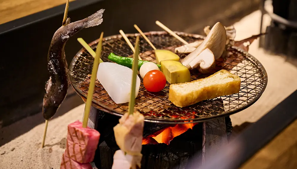 Each table is centered around an irori hearth grill, where staff with deep knowledge of ingredients and heat control guide guests to the ideal grilling point, with organic produce and carefully sourced ingredients brought to their best expression over irori charcoal. The seasonal vegetable selection is especially memorable – crisp, sweet and deeply flavorful when lightly charred on top of hōba (magnolia leaves traditionally used in Japanese cuisine). Premium cuts of Wagyu beef, pork, chicken and seasonal fish are grilled to the side of the glowing coals using traditional cooking methods that produce a minimal amount of smoke. A diverse selection of complex, mouth-watering sauces round out the experience, making for a meal that is indulgent – especially if you dig into the excellent whisky or sake selection – but grounded in rustic simplicity.
