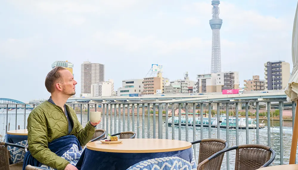 Here the atmosphere changes beautifully throughout the day. Afternoon visits bring soft light over the water and a relaxed, cozy feel, while evenings offer a more atmospheric experience as the river reflects the city lights. Since the cafe is open until 10 PM, you can visit the kotatsu terrace for a late dessert, a warm drink or a casual evening gathering without feeling rushed. From the outdoor terrace, you can also enjoy views of Tokyo Skytree rising across the Sumida River.