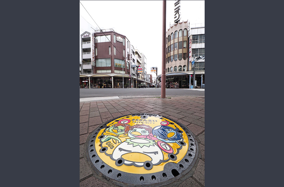 This custom-designed manhole cover features characters from the 2019 TV anime series Sarazanmai. The series depicts Taito Ward in detail, centering on the Kappabashi and Asakusa areas. Many anime fans adore these places as an anime mecca.