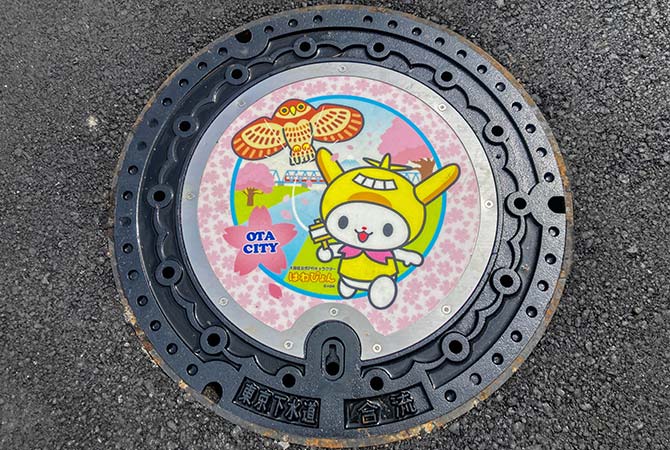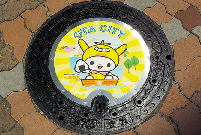 Custom-designed manhole covers featuring Ota Ward's official mascot character "Hanepyon" and local specialties are located in Kamata, Rokugo, and Omori in Ota Ward. The cover in Kamata features "Hanepyon and an airplane," the cover in Rokugo "Hanepyon and a black-kite-shaped kite," and the cover in Omori "Hanepyon, dried seaweed and Omori Furusato no Hamabe Park." The ward hopes the manhole covers help promote its residents' love for their hometown and local tourism.