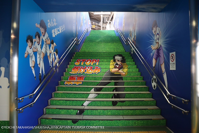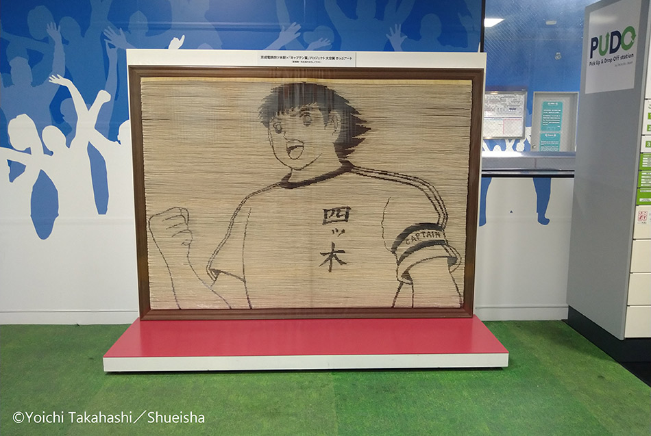 Many locations at Yotsugi Station are decorated with Captain Tsubara. The ending theme song (Moete Hero) of Captain Tsubasa animation is used as the melody that inform us of a train's coming to the station. In addition to the decoration inside the station, there is a Tsubasa Ozora ticket art exhibition (illustrated by Yoichi Takahashi) made by combining approximately 110,000 used tickets.