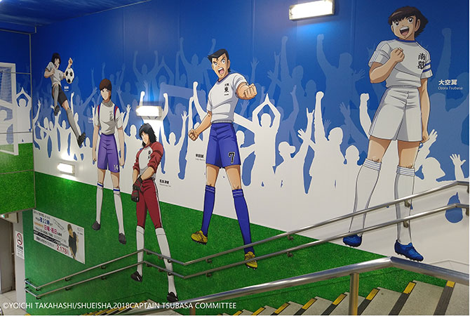 Keisei Electric Railway Yotsugi Station decorated with Captain Tsubasa illustrations