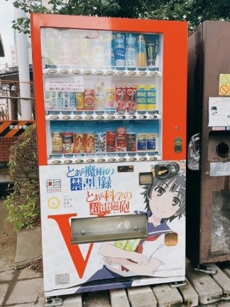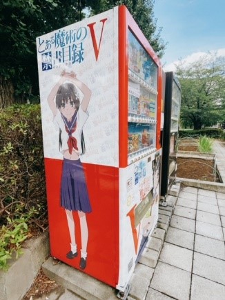 A vending machine wrapped with Kazari Uiharu and Ruiko Saten, two major characters of the TV animation, "A Certain Scientific Railgun," is located at the park. This vending machine offers coconut & pineapple cider, a limited-offer softdrink made by Tachikawa City.