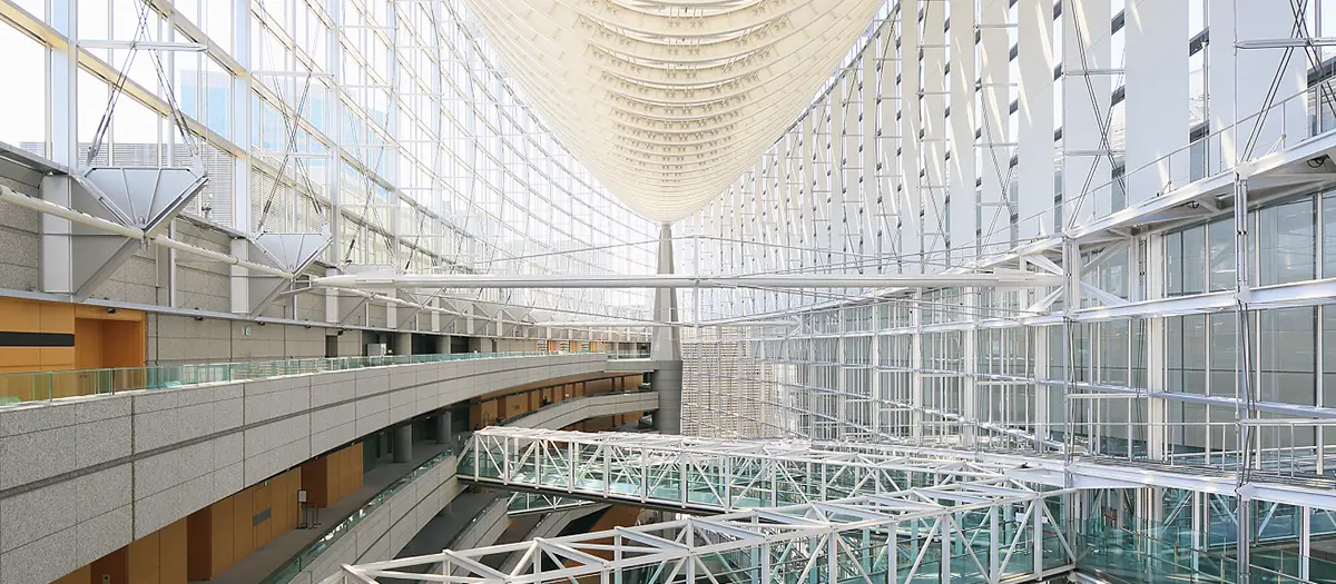 The complex, designed by American architect Rafael Viñoly, is a highly regarded architecturally, including the Glass Building, from its basement level to the 60-meter tall boat-shaped atrium, and is one of the representative landmarks of Tokyo. Between the 4 halls and glass atrium lies a green Plaza area, perfect as a rest area for visitors.