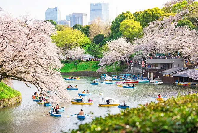 The Chiyoda Sakura-matsuri Festival will be held for an extended period starting in 2025. A variety of events are held in Chiyoda City during the spring, including a campaign offering discounts and perks at stores and other facilities. The annual yozakura, or nighttime illumination of cherry blossoms, will be held in Chidorigafuchi from late March to early April(2025-3-28 - 2025-4-8). As of 2025, some boat rides can even be reserved in advance. This allows you to rent a boat at your desired time without having to wait in line.