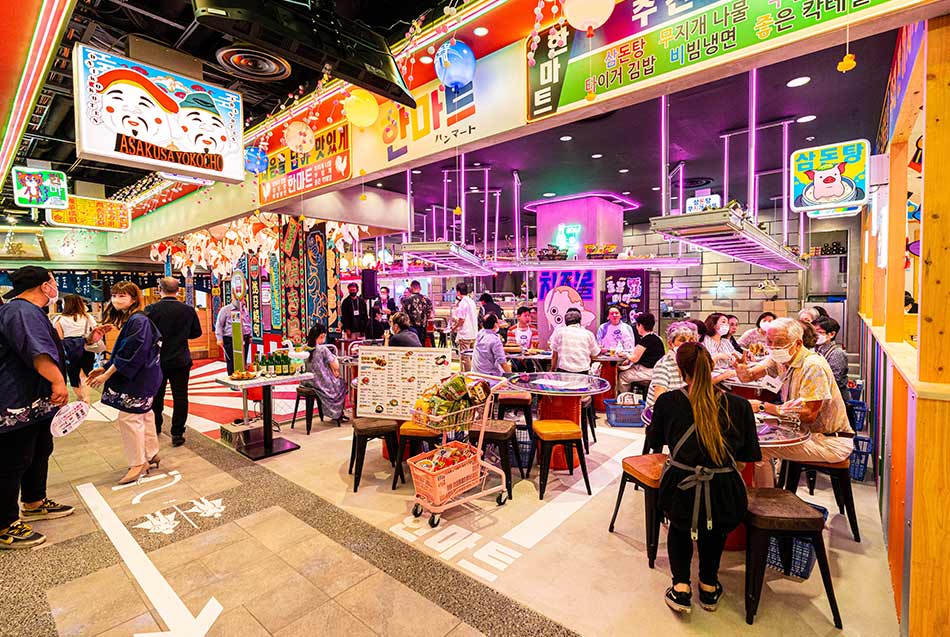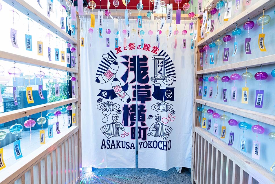 Colores vivos, farolillos brillantes y otras decoraciones festivaleras decoran Asakusa Yokocho, creando un ambiente festivo acentuado por la música matsuri que suena de fondo. La comida ofertada es informal e incluye brochetas de pollo yakitori, sushi, anguila a la brasa y cocina coreana. Y, por supuesto, también se ofrece cerveza y otras bebidas alcohólicas.