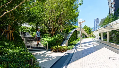 Green Walk es un nuevo y tranquilo paseo que conecta la estación Hamamatsucho y Blue Front Shibaura. Es más que una simple vía para los peatones –es una zona de calma desarrollada deliberadamente que incorpora la naturaleza en una infraestructura urbana cerca del frente marítimo. Este oasis de verdor es una acogedora y plácida zona de parterres, bancos sombreados y corrientes de agua, donde tanto los visitantes como los locales de camino al trabajo o de vuelta a casa pueden descansar y recargar energías.