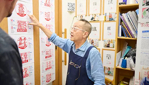 Crear un hanko empieza eligiendo la disposición, la fuente y el tipo de madera del puño. El amable propietario te guiará en la selección de los alfabetos hiragana, katakana o kanji para la parte en japonés, además de las fuentes que se ajustan a tus gustos. Los distintos kanjis tienen significados únicos y múltiples lecturas, y el propietario te ayudará a elegir caracteres con sonidos y simbolismos que se correspondan con la pronunciación de tu nombre y tu personalidad.