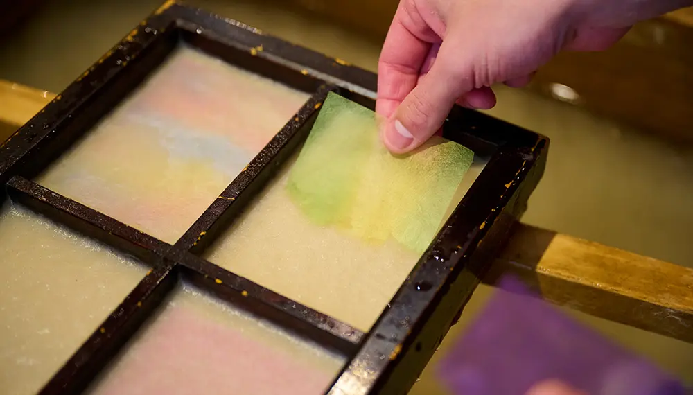 El paso final de la travesía es crear un soporte magnífico para tu postal –papel washi japonés, conocido por su resistencia, textura y belleza al filtrar la luz. En el corazón de Asakusa, la tienda de papel washi watashino y el estudio de elaboración de papel se especializan en talleres que presentan a los participantes la centenaria técnica de fabricación manual de washi.
