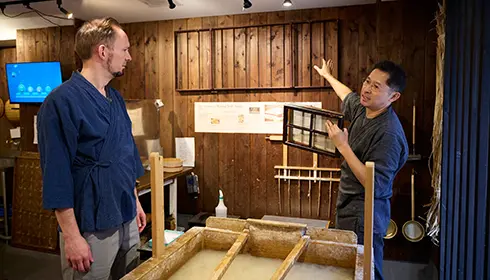 El personal habla inglés sin dificultad y brinda información relativa al proceso de fabricación, al tiempo que te ayuda a crear las postales de papel washi hasta el final. Podrás personalizarlas con adornos de papel washi colorido o incluso usar tu lado creativo y despedazarlos para crear un diseño artístico único. Otras ideas pueden incluir copos de oro, pétalos secos o fibras de tu elección. (Pregunta al personal de antemano en caso de desear traer tus propios adornos o ser creativo). El ambiente es tranquilo y sosegado; y no hace falta que te apresures mientras exploras la interacción entre la suave y agradable pulpa remojada en agua con los movimientos de la fabricación tradicional de papel.