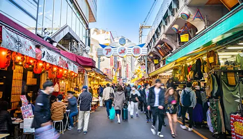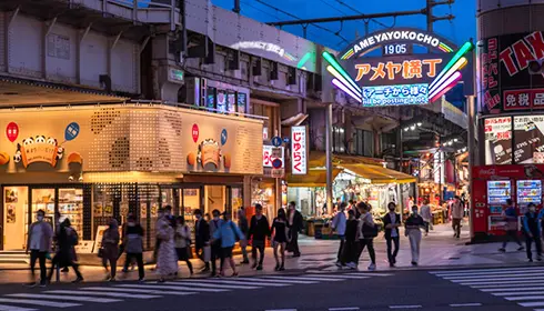 Rico en cultura, dinámico por naturaleza, y con una calle de ruidosos vendedores, Ueno es un remanso cultural y de ocio. El gran parque situado al lado de la estación acoge una gran cantidad de museos, un gran estanque con barcas, un santuario con una pagoda y un popular zoo. Sigue las vías del tren de la línea Yamanote hacia el sur para vivir la experiencia Ameyoko –un bullicioso mercado callejero.