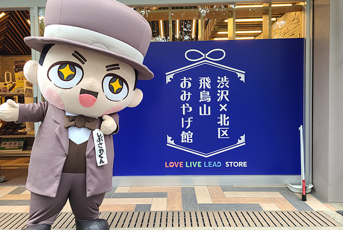 "Shibusawa-kun" es un personaje creado en Asukayama para heredar el entusiasmo de Shibusawa-ou. Difunde información sobre sus actividades a través de las redes sociales, stickers en LINE o actuaciones con disfraces, actúa como personaje publicitario del proyecto Eiichi-ou Shibusawa de Kita-ku de Tokio. En el Pabellón de souvenirs de Asukayama venden numerosos artículos de Shibusawa-kun que llaman la atención por sus diseños bonitos.