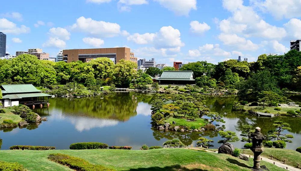 El aspecto más famoso del jardín, finalizado durante el periodo Meiji (1868-1912), son las valiosas piedras paisajistas diseminadas por el recinto, algunas de ellas procedentes de todo Japón. Descansando en el estanque hay un ryotei, un lugar de reunión, parecido a una casa de té y que se suma al aire tradicional del jardín.