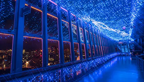 Puedes elegir entre subir en ascensor o a pie los 600 escalones hasta el observatorio principal, situado a 150 metros de altura. Si tienes suerte, los días soleados incluso puedes entrever el monte Fuji a lo lejos. Si no te asustan las alturas, haz una parada en el suelo de cristal de las “Skywalk Windows” y mira directamente abajo –a casi 145 metros bajo tus pies. El observatorio superior –a 250 metros de altura– está decorado con espejos geométricos y luces LED. Estar de pie allí te hace sentir como flotando sobre la ciudad en una nave espacial.