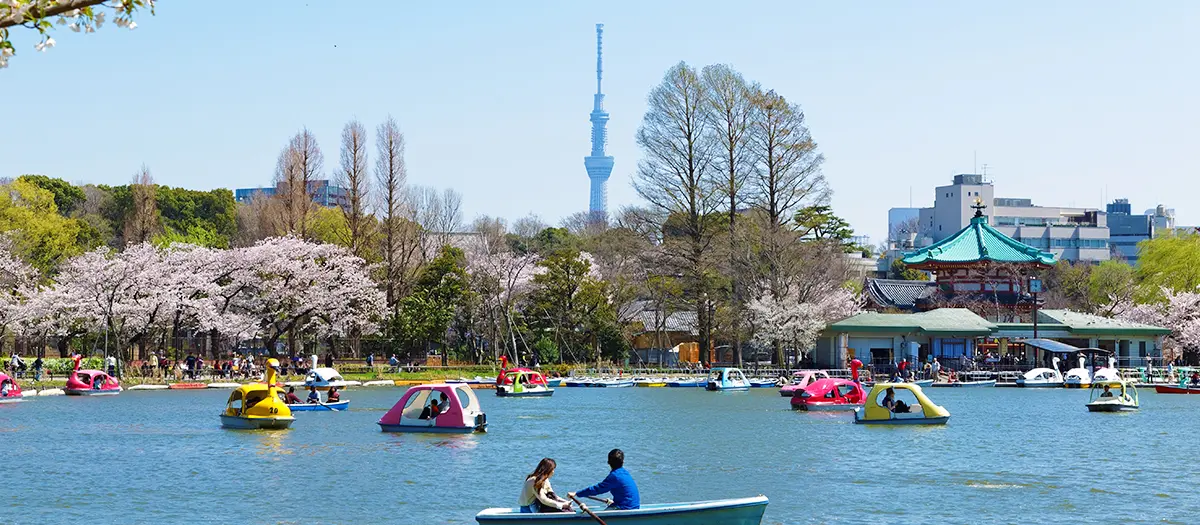 El estanque Shinobazu es un gran estanque natural lleno de exuberante vegetación y de gran valor cultural. El estanque tiene tres secciones: un estanque poblado por patos y otras aves acuáticas locales, un estanque de lotos y un estanque para botes.