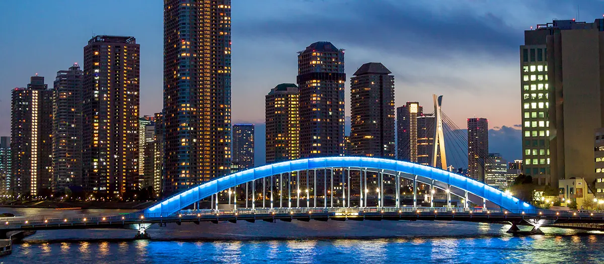 Con sus suaves curvas extendiéndose sobre el río Sumidagawa, el puente Eitai nos ofrece un indicio del Tokio de antaño y de una vida alejada del ajetreo y el bullicio de la metrópolis. No hay mejor manera de disfrutar del puente de tres vanos que cruzarlo, o pasar por debajo de él, en uno de los barquitos de baja altura que suben y bajan por el río.