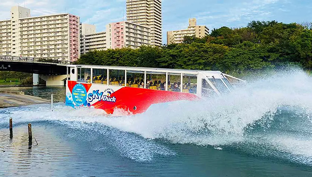Le Sky Duck est un véhicule amphibie recommandé aux familles en quête d’aventures et intéressées par une passionnante et excitante visite du front de mer de Tokyo. Le Sky Duck est orné d’une baleine rouge et bleu et les passagers montent à bord de son corps surélevé via une rampe. Le moment le plus attendu de la visite, surtout par les enfants, vient bientôt. Après une courte pause afin d’évaluer le vent et la marée, le Sky Duck prend de la vitesse en dévalant une pente et plonge dans l’eau au point de mise à l’eau. Une énorme gerbe d’eau engloutit l’avant de l’embarcation, comme sur un manège aquatique dans un parc d’attractions. Le Sky Duck passe alors en mode bateau et poursuit son parcours qui offre aux passagers à son bord une vue différente sur la zone du front de mer. La croisière passe sous le pont Rainbow Bridge, une structure gracieuse et élégante qui relie le centre de Tokyo aux terrains gagnés sur la mer, offrant une vue unique sur l'arrière du pont. Le bateau revient ensuite au point de mise à l’eau et retourne sur la terre ferme. La visite complète dure environ 50 min.