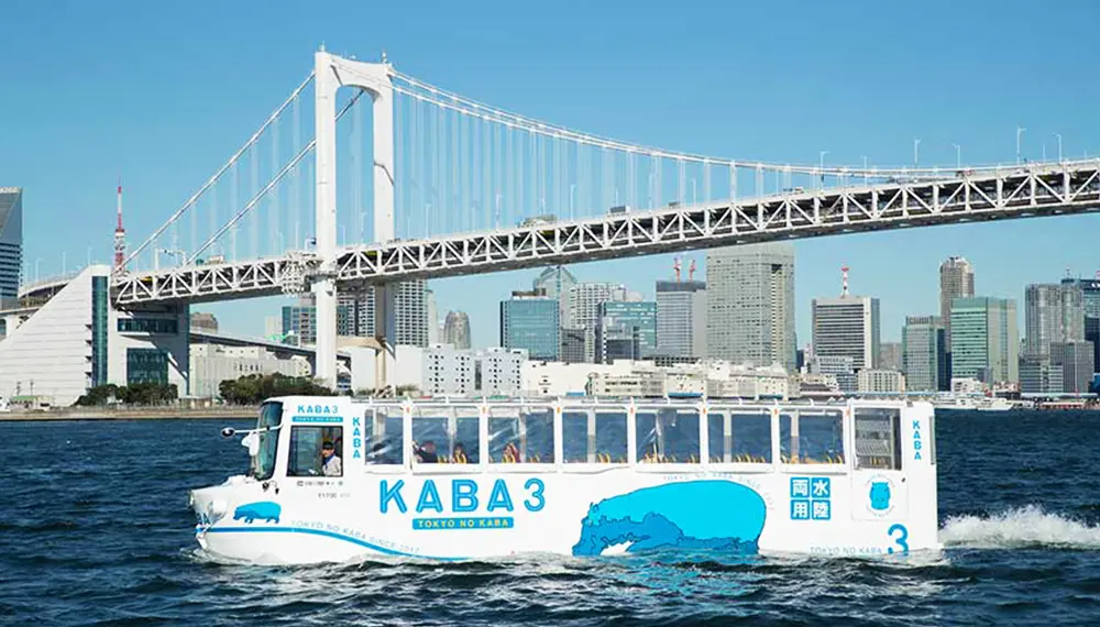 Tokyo no Kaba est un autre bus amphibie qui circule régulièrement à Odaiba. « Kaba » signifie hippopotame en japonais, et c’est de cet animal que s’est inspiré la conception du bateau. Des illustrations d’un grand hippopotame bleu décorent les quatre côtés du bus et toutes les housses de siège sont à l’effigie d’hippopotames colorés. De nombreux passagers font remarquer que le nez allongé du bus rappelle également le grand mammifère aquatique. Comme pour le Sky Duck, le personnel du Tokyo no Kaba analyse la force du vent et la vitesse du courant avant que le bus ne fasse le grand plongeon dans l’eau, tel un hippopotame entrant dans l’eau d’un lac. Évidemment, une fois dans l’eau, le bus cesse d’être un véhicule terrestre et utilise une hélice pour avancer à une vitesse de six nœuds avec un gouvernail pour contrôler sa direction. Un système de son 3D, le premier du genre au monde, vient enrichir cette expérience unique qui permet de naviguer sur les cours d’eau de Tokyo à bord d’un « hippopotame » amphibi