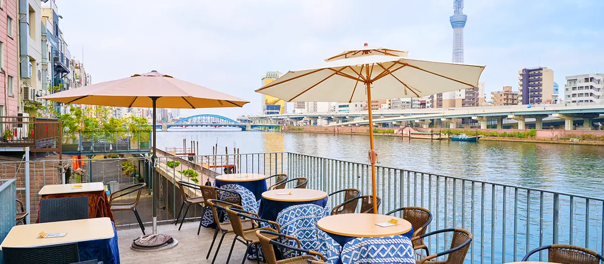 L’atmosphère change magnifiquement tout au long de la journée. L’après-midi, on profite de la douce lumière à la surface de l’eau et d’une ambiance chaleureuse et détendue. Les soirées offrent une atmosphère plus féerique, avec les lumières de la ville qui se reflètent sur l’eau. Le café étant ouvert jusqu’à 22 h, on peut se rendre sur la terrasse kotatsu pour un dessert tardif, une boisson chaude ou une discussion décontractée sans se sentir pressé. Depuis la terrasse, on peut également apercevoir la tour Tokyo Skytree qui se dresse de l’autre côté du fleuve Sumida.