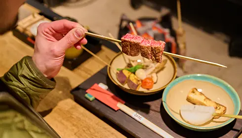 Chaque table s’organise autour d’un irori équipé d’un grill. Le personnel, doté d’une grande connaissance des ingrédients et d’une parfaite maîtrise de la chaleur, guide les clients jusqu’au point de cuisson idéal, avec des produits biologiques et des ingrédients rigoureusement sélectionnés sublimés par une cuisson au charbon de bois. La sélection de légumes de saison est particulièrement impressionnante. Ceux-ci sont croquants, doux et profondément savoureux lorsqu’ils sont légèrement grillés sur du hoba (feuilles de magnolia traditionnellement utilisées dans la cuisine japonaise). Les morceaux de bœuf wagyu, de porc, de poulet et les poissons de saison sont grillés à côté du charbon ardent selon des méthodes traditionnelles produisant très peu de fumée. Une sélection variée de sauces complexes et appétissantes vient compléter l’expérience pour en faire un repas fastueux, surtout si vous vous laissez tenter par l’excellente sélection de whiskys et de sakés, le tout restant ancré dans une simplicité rustique.
