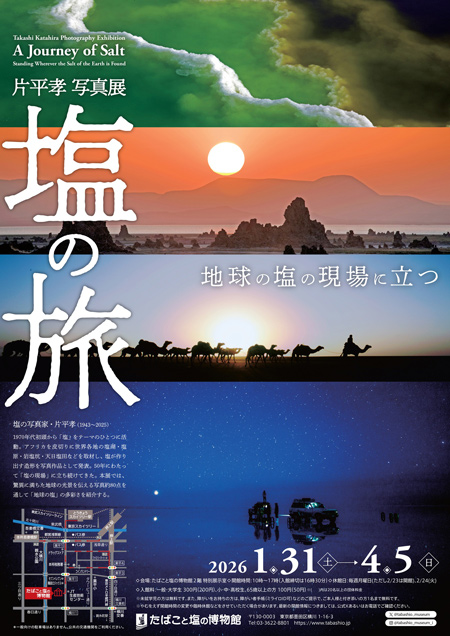 An exhibition of works from photographer Takashi Katahira, who has traveled the globe taking salt-themed photos since the early 1970s. Introducing scenes of salt created by the earth itself that would be unimaginable in Japan.