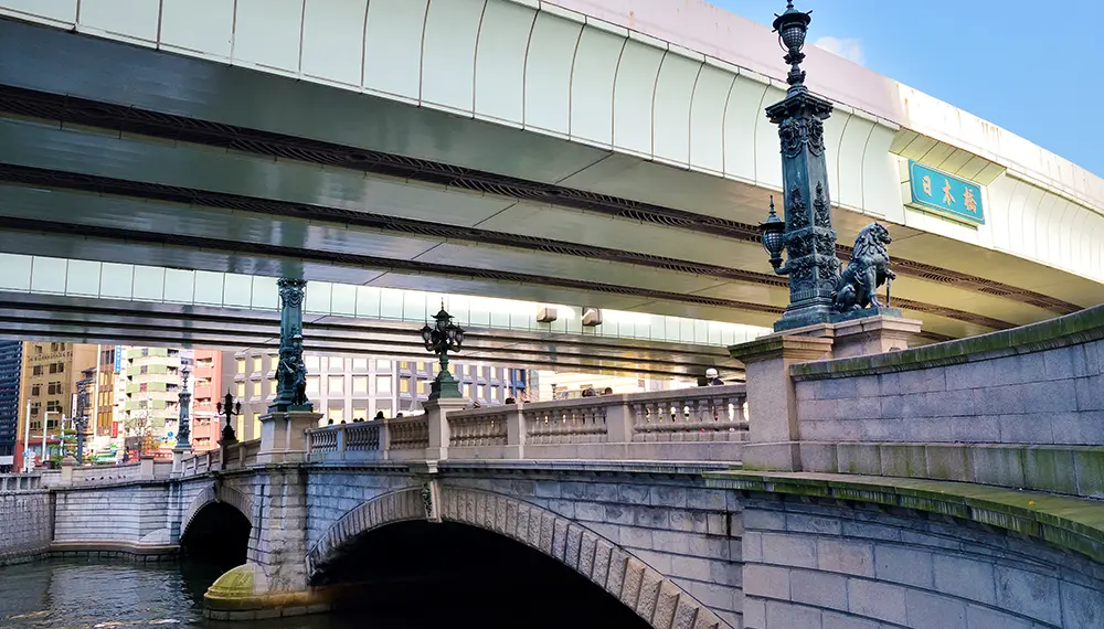 Le pont Nihombashi a été construit en 1603, l’année de la mise en place du shogunat des Tokugawa. Cet endroit pionnier d’Edo était le point de départ des cinq grandes routes qui reliaient Edo à Kyoto et aux autres lieux importants du pays. Aujourd’hui, ce pont est situé au kilomètre zéro, le point à partir duquel sont mesurées toutes les distances entre Tokyo et le reste du pays.