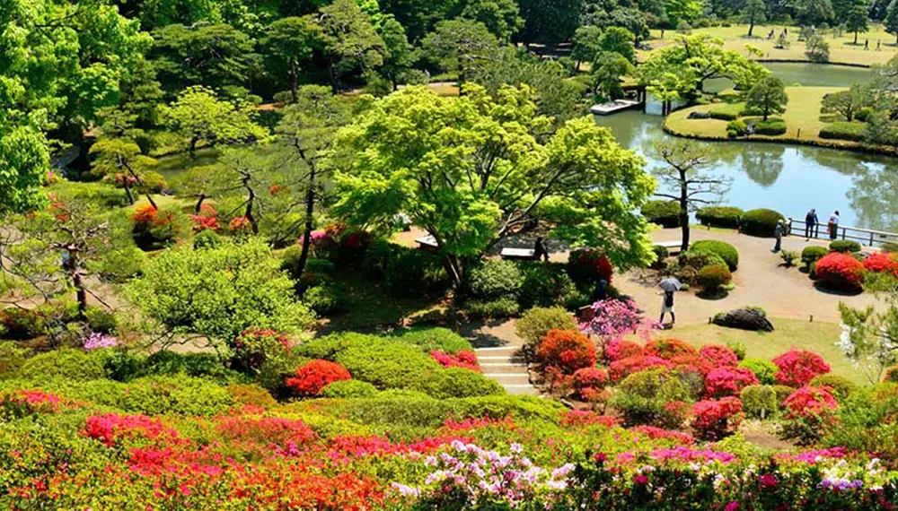 Le jardin révèle toute sa beauté au printemps, lorsque les cerisiers sont en fleur, et en automne, lorsque les feuilles d’érables et de zelkova deviennent rouge ardent. Durant ces saisons, le jardin propose des horaires d’ouverture prolongés, avec des éclairages créant à la nuit tombée un paysage à couper le souffle.