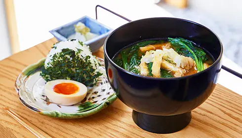 Il existe divers endroits où déguster un petit-déjeuner japonais traditionnel dans le quartier de Shitamachi, au centre de Tokyo. Misojyu est un établissement spécialisé dans la soupe de miso situé à Asakusa. Sa vocation est de donner aux gens l’occasion de goûter à la soupe de miso et de leur faire découvrir une partie importante de la culture alimentaire du Japon. Outre sa soupe de miso saine à base de légumes biologiques, il propose également des boulettes de riz onigiri. Un panneau d’information en anglais se trouve à l’intérieur de l’établissement, ce qui facilite les commandes.