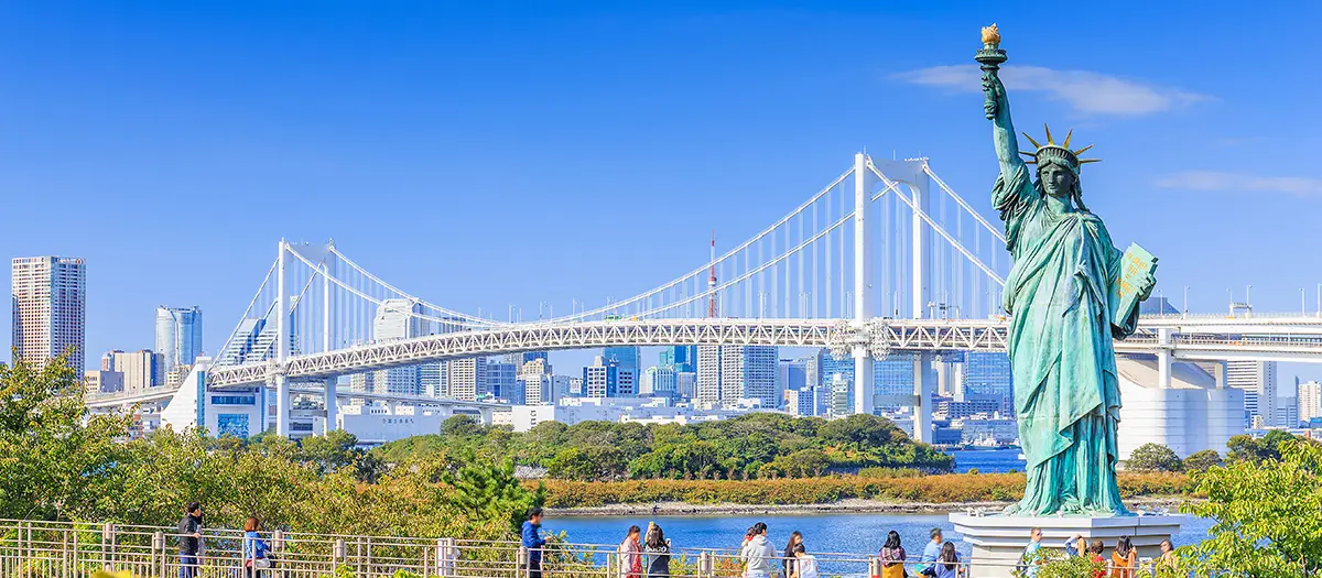 Pour un aperçu de New York avec différentes vues sur la baie de Tokyo en arrière plan, visitez la réplique de la célèbre statue de la liberté d'Odaiba. Bien que sa localisation en face du Rainbow Bridge à proximité donne l'impression qu'il s'agit d'une réplique à l'identique, elle ne fait en réalité qu'un septième de la taille de l'original à New York.