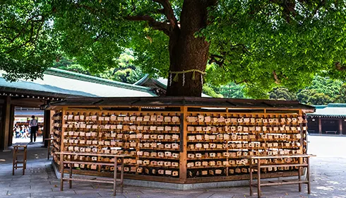 Le sanctuaire Meiji Jingu rend hommage à l'empereur Meiji et à l'impératrice Shoken, qui dirigaient le Japon durant une période de modernisation rapide commencée dans la seconde partie du 19e siècle. La vaste forêt de l'établissement, qui s'étend sur environ 70 hectares, a été créée en transplantant environ 100 000 arbres donnés de tout le Japon. Le sanctuaire a célébré son 100e anniversaire en 2020.