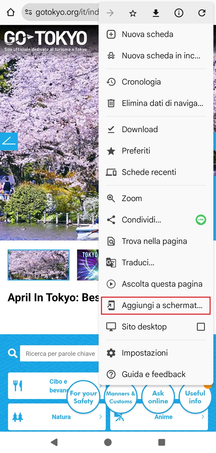 Quando in basso sullo schermo compare Preferito significa che GO TOKYO è stato inserito tra i siti preferiti sull'Android.