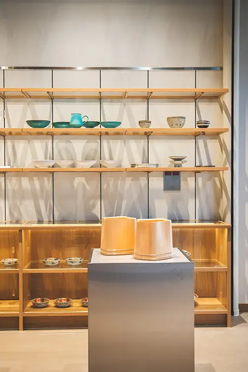 Raccomandiamo anche i pezzi di ceramica, vanto del negozio. Gli articoli in ceramica Asahi-yaki sono un'opportunità per portarsi a casa un'opera d'arte. Realizzate artigianalmente da circa 400 anni, queste ceramiche di Kyoto sono state a lungo utilizzate nella cerimonia del tè. Ciotole e tazze yunomi create appositamente per questo negozio col distintivo smalto blu cobalto "ruriyu" sono un piacere della vista.