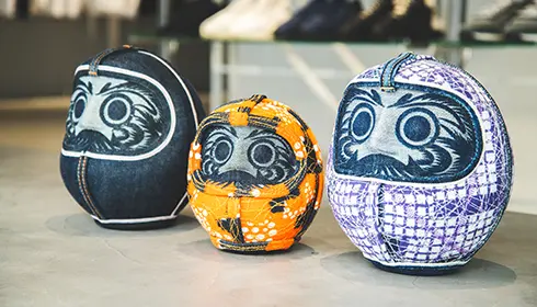 "Denim Daruma" rappresenta una svolta per il souvenir "Daruma", vecchio di secoli, una bambola rotonda e dagli occhi grandi che ha il nome del monaco fondatore del Buddhismo Zen.